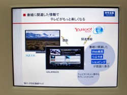 加えて、視聴中の番組に関する情報をタブレット端末などで楽に確認できる「テレビアシストサービス」のコンセプトデモをYahoo!JAPANが実施。Yahoo!が用意した番組情報サイトを、AQUOSとWi-Fi接続したタブレットで確認できるというもので、番組で紹介されているスポットや出演者の情報などを閲覧できるほか、関連したエントリーを書いているブログを検索して読んだり、番組で紹介された商品をそのままインターネットから注文するといったことも可能。