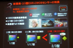撮像素子として2/3型 1,200万画素EXR CMOSセンサーを搭載。シーンに合わせて1つのセンサーを高感度・低ノイズ優先/ダイナミックレンジ優先/高解像度優先の3つに切り替えて撮影できるEXR技術とCMOSを組み合わせることで、さまざまなシーンで高画質撮影を実現するという。「2/3型と受光面積が広く、十分に光を取り入れられるほか、高感度低ノイズなのが特徴」(同社 古森社長)とのこと。