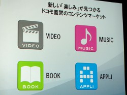 もう1つは「d market」。こちらでは、「VIDEOストア powered by BeeTV」や、「MUSICストア powered by レコチョク」、「BOOKストア」に加え、ドコモのお薦めアプリを厳選して紹介する「アプリ&レビュー」の4サービスを提供する。