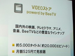 「VIDEOストア」は、国内外の映画・テレビドラマ・アニメ・音楽などのラインナップを揃える動画配信サービス。月額525円で約5,000タイトル/約2万エピソードのコンテンツが見放題となる。動画の視聴時には、動画をスマホにダウンロードする形式とストリーミング再生形式のいずれかを選択することができる。フォーマットはMicrosoft「プレイレディ」のDRM仕様に乗っ取ったMP4形式で、ビットレートは1コンテンツにつき1.5Mbps/500kbps/300kbpsの3種類を用意している。