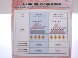 同方式では、映像を表示するパネルの上に重ねた液晶レンズと呼ばれる液晶パネルに集光機能を付加し光路を変更。これにより左右に画像を分離するため、光をより有効に利用でき、高精細で明るい3D画像の表示が可能になるという。