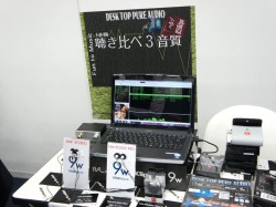 また、MP3、WAV、ハイレゾ音源という3種類の音源による聴き比べを行うコーナーも展開。同社取り扱い製品を使って音源による音の違いを体験できるようにしていた。