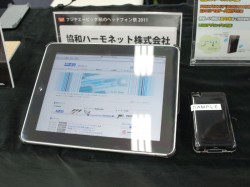 また、第四世代のiPod Touchに取り付けるWi-Fiルーター“ジャケットワイヤレスルータ”「HE-WR01」も展示。ドコモが提供する定額データプランを利用できるようにするアクセサリーで、ブースではiPadとともにデモを行っていた。