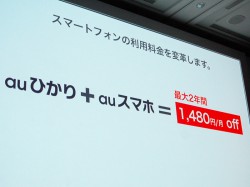 さらに同社は、FTTH・CATV事業者と連携し、指定の固定通信サービスと組み合わせることでauスマートフォンの利用料が最大2年間で1,480円(税込)割引される新料金体系「au スマートバリュー」を発表した。こちらも3月1日からの提供開始を予定し、2月14日から申し込み受付を開始する。