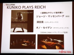 「kuniko plays reich」は、スティーブ・ライヒ氏の80年代の作品「Counter Part」シリーズを、打楽器用にアレンジし直して演奏した作品。プリレコードした楽曲を再生し、それに生演奏を重ね合わせるという楽曲群で、加藤さんは再生用のスピーカーにECLIPSE TDを使っている。