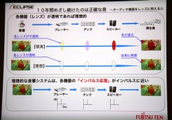 小脇氏は、音源から再生音に至るまでに通る、プレーヤー、アンプ、スピーカーなどをレンズに例え、「各レンズが透明であれば、音源を忠実に再現できる。これが理想だが、現実は完全に透明とはいかない」と説明。その上で、レンズを音響システムとして捉え直したとき、各機器の「インパルス応答」がインパルスに近ければ近いほど、音楽波形がより正確になる、という同社の主張を改めて展開した。