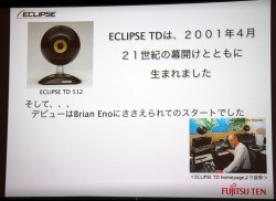 説明会にゲスト出演した深田氏は「ECLIPSE TDとの出会いは、2004年に小脇さんがスタジオに製品を持ってくれたのが最初」と振り返り、「スタジオでは色々なスピーカーを使うが、2ウェイ、3ウェイだと位相の問題があるので、シングルコーンを使うことがある。中でもECLIPSE TDは空間再現性が良いので重宝している」とコメントした。