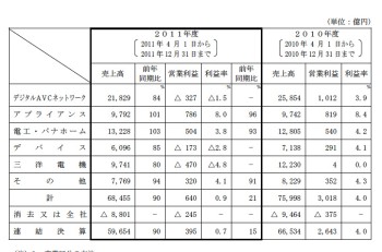 三洋電機部門は売上高9,741億円(同80%)。太陽光発電システムやコールドチェーン機器などは堅調に推移したが、電子部品や白物家電、デジカメ、テレビなどの売り上げが減少したこと、そして2010年度に実施した半導体事業の譲渡の影響もあり、減収となった。営業利益は、売上減の影響に加え、買収に伴い形状された無形固定資産の償却費等を含めて470億円の損失となった。