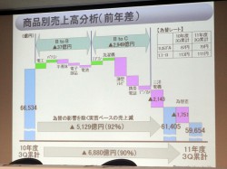 タイの洪水や世界的景気後退によりデジタル製品の売り上げが大幅に減収となる見込みであること、営業利益も、売上減を固定費削減ではカバーしきれない見込みであること、そして税引前利益には、営業外費用として三洋電機の“のれん減損”などを含む追加の事業構造改革費用2,500億円や、株式市況低迷による保有株式の評価損を見込んでいることなどを理由として説明。