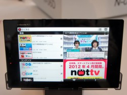 本機は4月から開局するmmbiがサービスインを予定しているV-Highマルチメディア放送(モバキャス)でのスマートフォン向けサービス「NOTTV(ノッティーヴィー)」(関連ニュース)の視聴に国内で初めて対応したタブレット。リアルタイム視聴に加え、予め登録しておいた番組をmicroSDメモリーカードに記録しておき、好きな時に視聴できる「シフトタイム視聴」にも対応する。