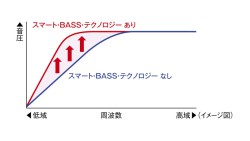 サブウーファーには新機能「スマート・BASS・テクノロジー」を搭載。直接的な低域強調ではなく、心地よい音の広がりや厚みを聴感上で感じられる効果を生む、音響心理を利用したアルゴリズムを採用している。