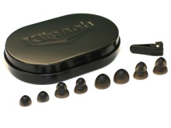 本日同時に発表された「Reference One」(関連ニュース)同様に、耐久性に優れるという新ケーブルを採用。ブラックに銅色のアクセントをあしらったカラーリングとすることで、スピーカーの上級モデル「Reference」と共通イメージを持たせた。交換用イヤーピースなどの付属品のカラーリングもブラックにしている。