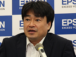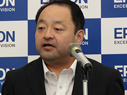 本日開催されたエプソンによる記者向けの新製品発表会では、エプソン販売(株) 取締役 販売推進本部長 鈴村文徳氏が登壇し、「エプソンとしては、プリンター製品だけではなく幅広い分野において技術展開していきたい。その中心となるのが映像部門であり、プロジェクター事業だ。エプソンのプロジェクター事業は、コアデバイスを持っていることが武器であり、製品の企画・設計・製造・営業まで全てを手がけられることが大きな強みである」と語った。