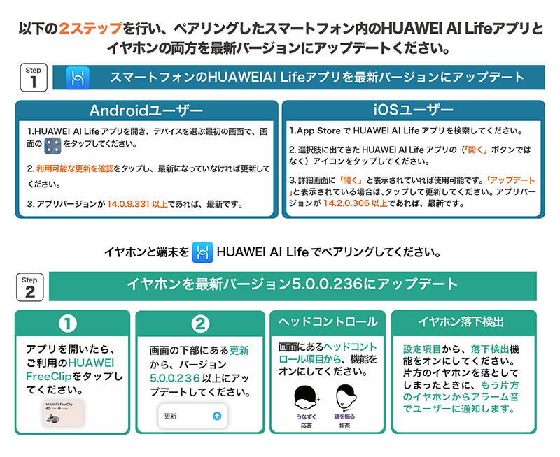 新機能の利用には、スマートフォンアプリ「HUAWEI AI Life」を最新バージョンまでアップデートした上で、イヤホンを最新デバイスバージョン5.0.0.236にアップデートする必要がある。既存のHUAWEI FreeClipに対しては、すでにアップデート通知が順次開始されており、1月中には全てのHUAWEI FreeClipがアップデート可能となるとのこと。