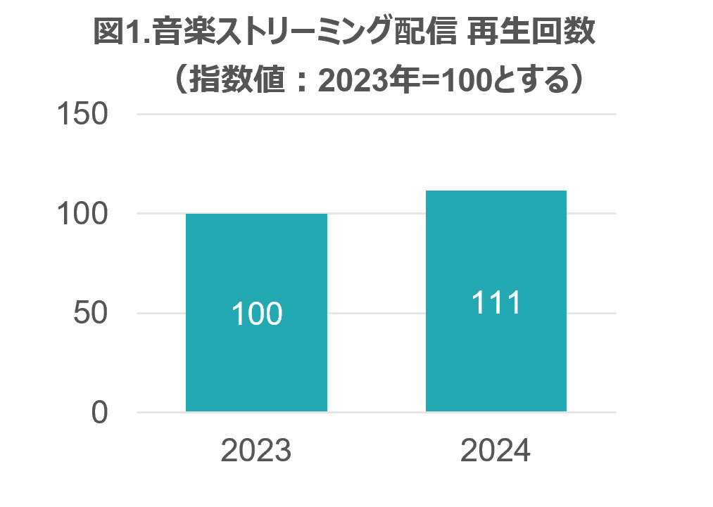 音楽ストリーミング配信市場については、Amazon Music Prime/Amazon Music Unlimited/Apple Music/au スマートパスプレミアム ミュージック/AWA /KKBOX/LINE MUSIC/Rakuten Music/Spotify/TOWER RECORDS MUSIC powered by レコチョク/ YouTube Musicを対象に集計を実施。市場は伸長率が減少傾向であるものの、2024年の総再生回数は前年比11%増となった。