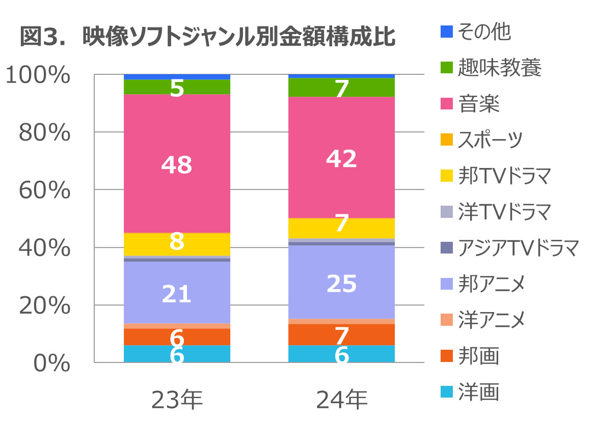 ジャンル別の金額構成比では音楽が最大ジャンルとなったが、好調であった前年から6%ポイント縮小の42%に。邦アニメは映画『THE FIRST SLAM DUNK』などのリリースで構成比を4%ポイント伸長させた。同社の調査では市場のソフトパッケージを11カテゴリに分類しているが、音楽、邦アニメの2ジャンルが全体の金額構成比の67%を占めていると算出した。