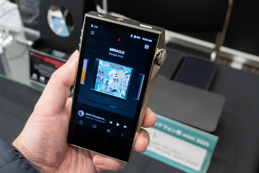 アユートが取り扱うAstell & Kernから今回初登場となったのが、最上位DAPを小型化した「A&ultima SP3000M」のバリエーションモデル“Copper Nickel”。その名の通り、筐体素材に銅とニッケルの合金(白銅)を採用しており、アルミニウム合金製の通常モデルよりもずっしりとした重みが感じられるようになっている。実は今回が世界でいち早いお披露目とのこと。今月中には正式アナウンス予定で、価格は約49万円程度が見込まれるという。