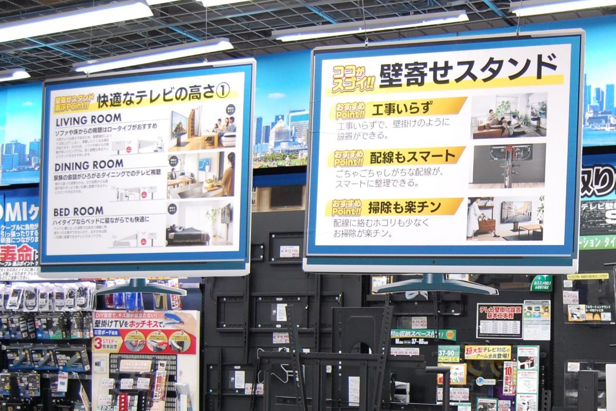「壁掛け」にする選択肢もあり、もちろん対応しているが、「お客様からは壁掛けの要望ももちろんあります。しかし、壁に穴を空けたり、補強したりする工事の内容や取り付ける金具、料金などを説明していくと、最終的に壁寄せスタンドに落ち着くケースが多くなっています」と説明する。