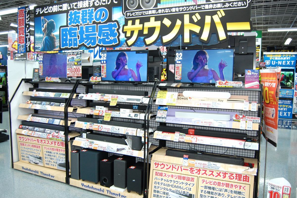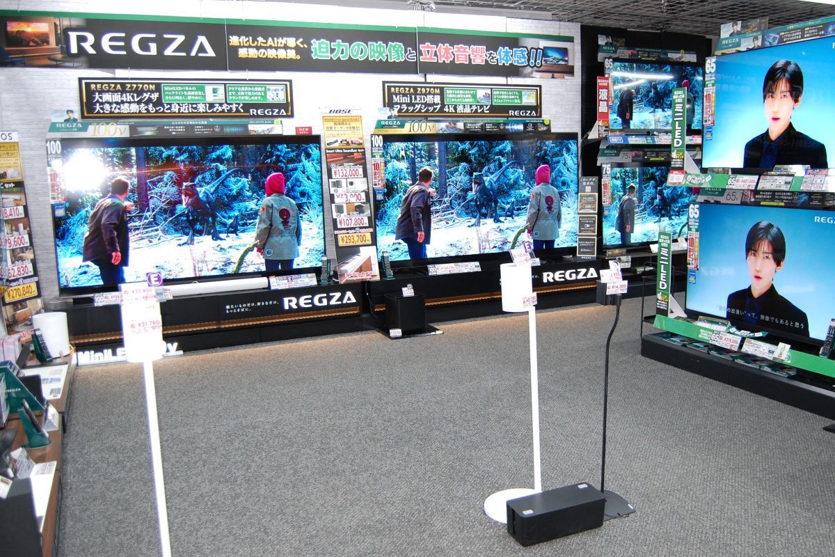 お客様にはテレビにスピーカーを加える意義を説明するだけでなく、出来得る限り実際に試聴していただいており、店内に展示するテレビにも、サウンドバーをはじめとするスピーカーを組み合わせた展示が数多い。