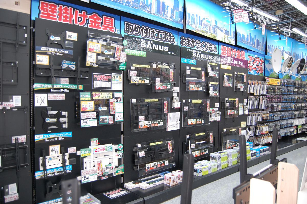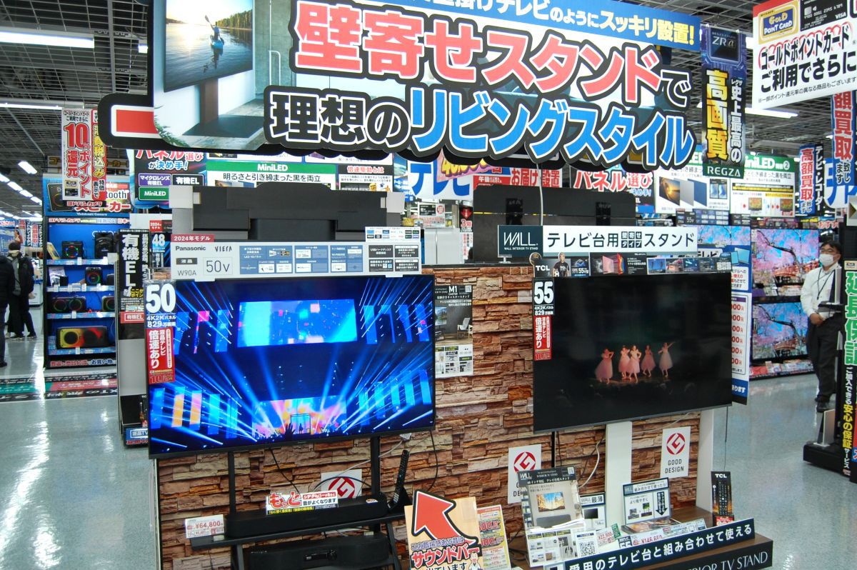 そして、もうひとつの相棒が「壁寄せスタンド」だ。「大きなテレビをできるだけ省スペースに導入したい」「部屋を広く使いたい」といった要望に応えるもので、展示するテレビも多くが壁寄せスタンドと組み合わせられ、「壁寄せスタンドコーナー」にはズラリと商品が並べられている。