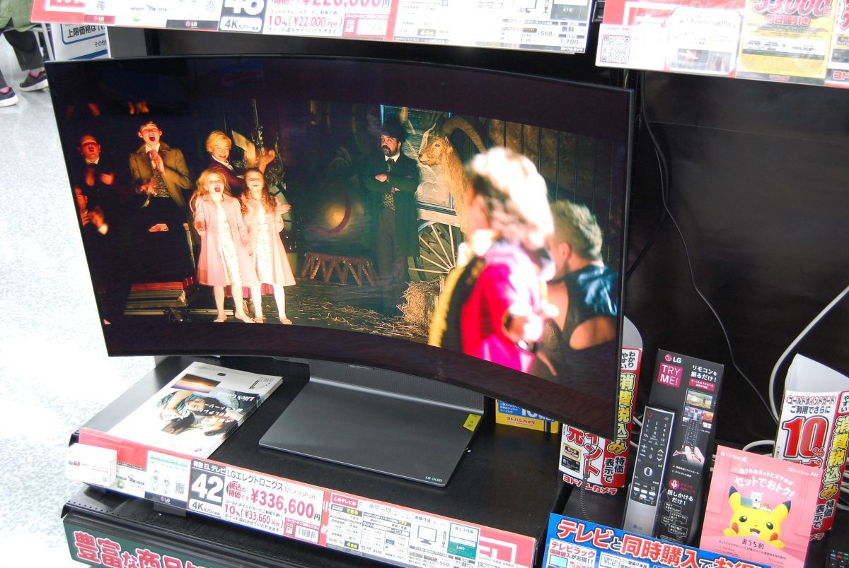 大型家電量販店のテレビコーナーへ足を運ぶと、そこで目を奪われるのが画面サイズのさらなる大型化だ。ヨドバシカメラの旗艦店「ヨドバシカメラ マルチメディアAkiba」(東京都千代田区)では、実に70V型以上のテレビ47台が展示されている。そのうち80V型以上が21台、115V型を筆頭にした100V型クラスも4台あり、まさに目を丸くする光景が広がっている。