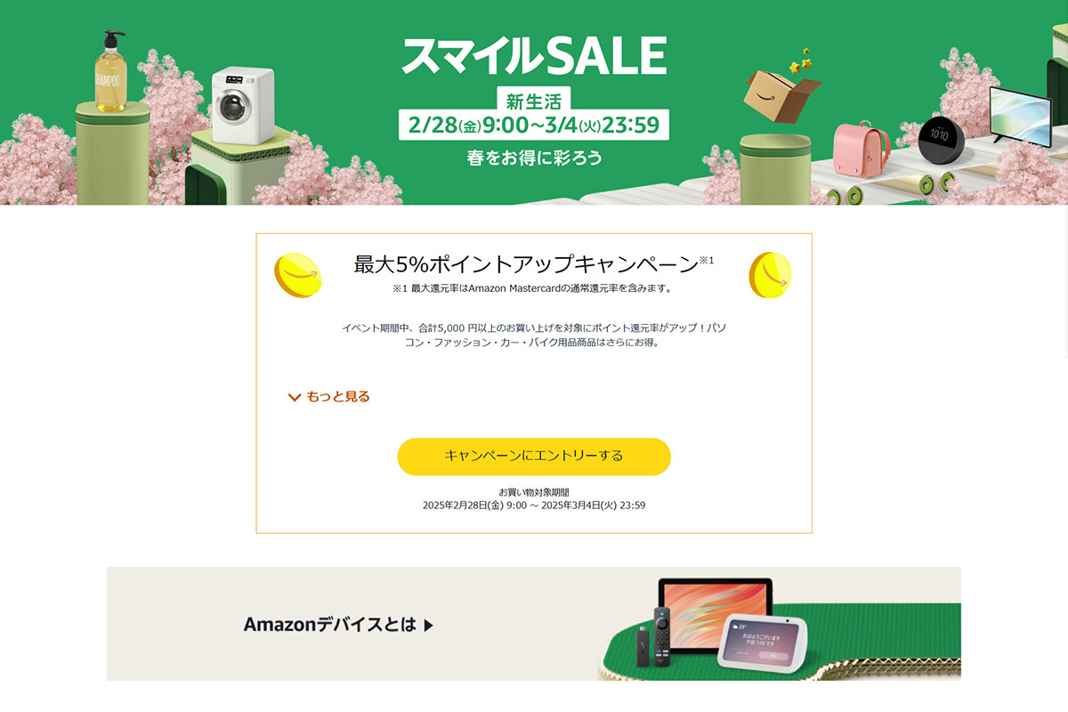 AmazonAmazon スマイルSALE 新生活は2月28日(金)9時から3月4日(水)23時59分までの開催。その他詳細はAmazon公式ページで確認できる。