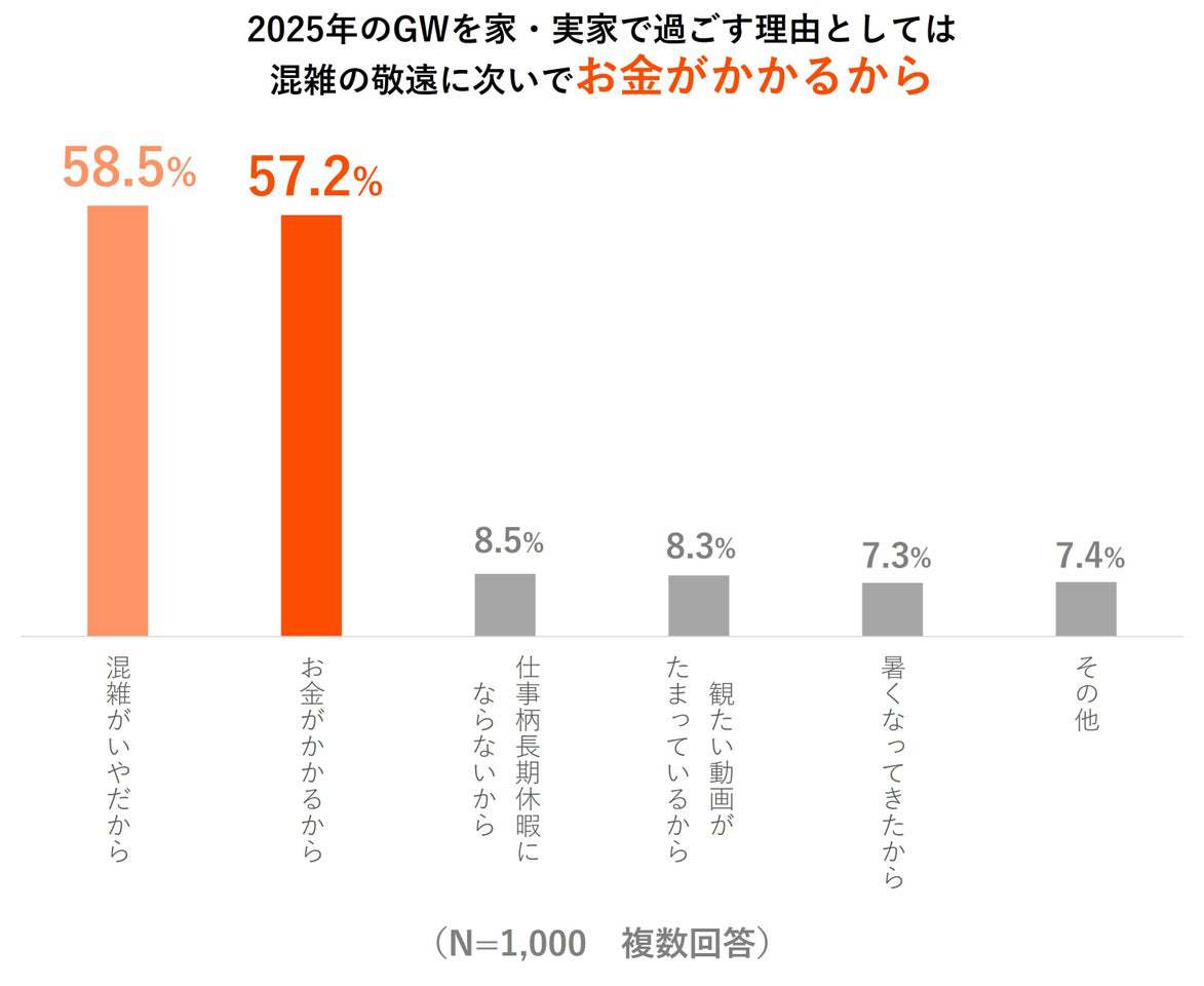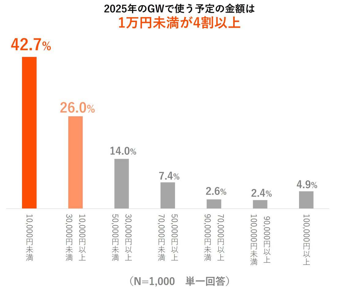 「家・実家で過ごす」と回答した理由(複数回答可)については、「混雑がいやだ」が58.5%と最も多く、次いで「お金がかかるから」が57.2%にのぼったと説明。さらに「ゴールデンウィークに使う予定の金額」については、全体の約4割にあたる42.7%が「10,000円未満」と回答したとのことで、外出のみならず、出費も抑える傾向にあるとしている。
