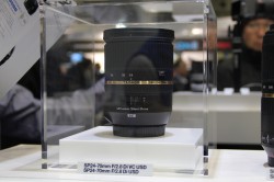 タムロンブースには、手ブレ補正機構を内蔵しつつ小型化を実現した、24-70mm/F2.8のレンズが参考出展されている。