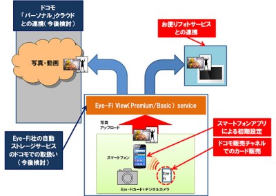NTTドコモと米Eye-Fiは、Eye-Fiが提供する「Eye-Fiカード」および「Eye-Fiカード」を利用した写真・動画データのストレージサービスと、ドコモのパーソナルクラウドをはじめとしたサービスを融合させることを目的に業務提携した。またドコモは、両社の関係を強固なものとし上記のサービス融合を推進するため、Eye-Fi社が呼びかけを行った総額約2,000万USドルの出資募集に対して約1,400万USドルの出資を行った。