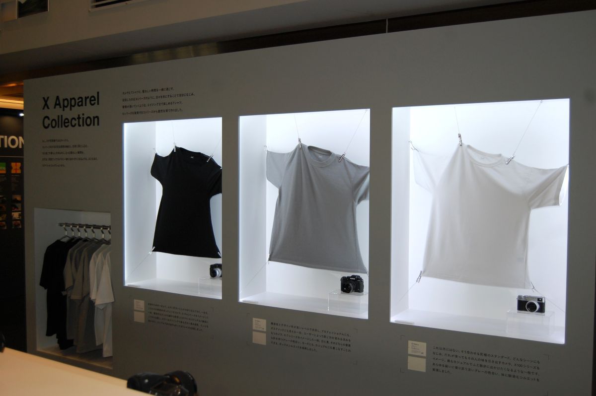 Xロゴ入りオリジナルTシャツ(3色)も数量限定でお目見え。「日常でカメラとともに着ていただきたい」というアパレルコレクションで、シルエットをイトにした黒はX-Proシリーズ、モードにもカジュアルにも着こなせるグレーはX-Tシリーズ、カジュアルで散歩にも出かけたくなる白はX100シリーズをそれぞれイメージしている。