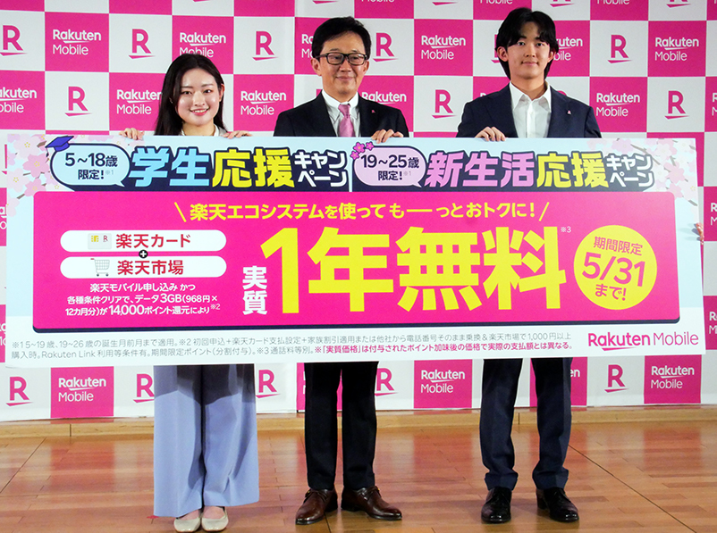 このキャンペーン施策は主として学生を対象とした「学生応援キャンペーン」と、新社会人など若い世代をターゲットにした「新生活応援キャンペーン」の2つから成り立っている。前者は5〜18歳の新規契約者に対して、後者は19歳から25歳までの他社から乗り換え契約した人に対して、それぞれ最大1万4,000ポイントを還元するもの。さまざまな条件の違いはあるが、いずれのキャンペーンも最大限付与されたポイントを利用すれば、データ通信量3GBまでであれば実質1年間は「Rakuten最強プラン」を無料で利用できるとしている。