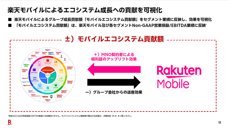 とりわけ通信サービスに関しては、2024年に提供した一連の割引施策もあって契約数は増えたが、ARPU(1ユーザー当たりの平均売上高)を上げるのが難しくなっている。それゆえ楽天モバイルは2024年度3月期決算より、ARPUに通信料金だけでなく「モバイルエコシステム貢献額」、要は楽天モバイル契約者が「楽天市場」など楽天グループのサービスを利用して得た利益の貢献額を加えるという “荒業” を実施しているのだ。