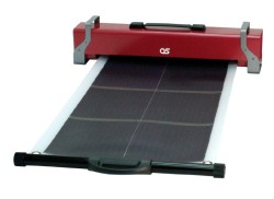 富士電機システムズが開発した薄型・軽量のアモルファス太陽電池シートと、オーエスがプロジェクター用スクリーンで培った巻き取り機構技術を組み合わせた商品。ケースに収納された太陽電池シートをスムーズに引き出せ、好みの位置で停止させたり巻き取ったりすることができるという。