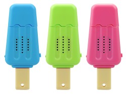 アイスキャンディー型「GH-SPA108ICE」は、外形寸法38.3W×92H×16.5Dmm、質量約26gでソーダ/メロン/ストロベリーの3色を用意。マイク型「GH-SPA108ICE」は、外形寸法37W×84H×37Dmmで、質量は約28g。ブルー/イエロー/ピンクの3色をラインナップしている。