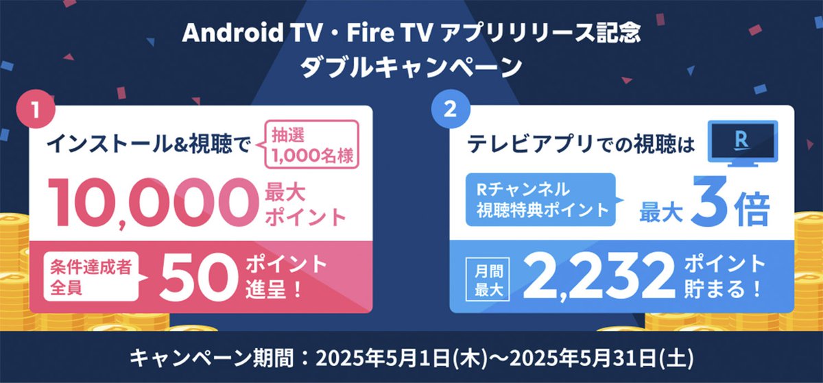 テレビ向けアプリの提供開始に伴い、5月1日(木)から5月31日(土)までの期間に2つのキャンペーンを実施。