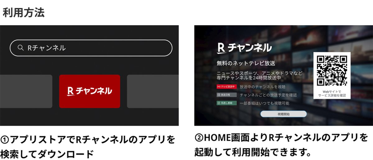 「Rチャンネル」は、アニメ/映画/ドラマ/ニュース/スポーツ/エンタメ/趣味/キッズなど、幅広いジャンルの番組を、24時間・365日無料で視聴できるリニア型動画配信サービス。同種のサービスでは国内最大級の46チャンネルを展開する。