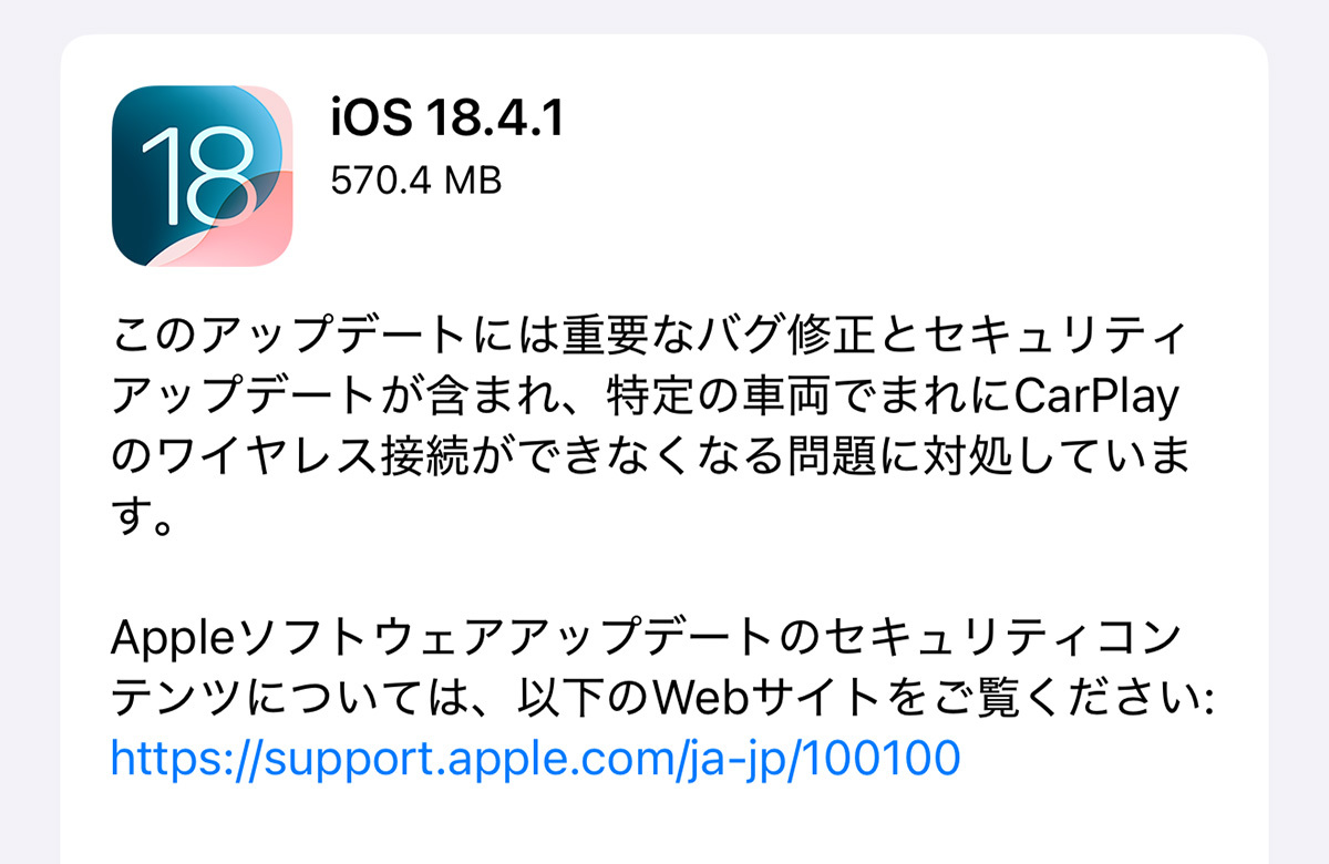 またiOS 18.4.1では、特定の車両でまれにCarPlayのワイヤレス接続が行えない問題にも対処している。
