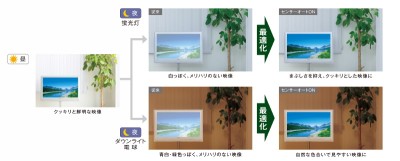 他には、室内の照明色をセンサーが自動判定、視聴環境に合わせて画質(明るさ、色温度、ガンマカーブ等)を自動調整する「インテリジェント・オート高画質」を搭載した。他社の場合、照明の種別の判定はマニュアルで入力するか、オプションのセンサーを買わないといけなかったから、一歩進んだ自動調整機能といえる。