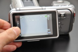 ハンドリングの感触はビデオカメラではなく、むしろデジタルカメラに近い。3型のタッチ液晶モニターは上方に180度スイングするので、ローアングルの撮影でも構図の確認が容易だ。グリップが大きいので安定して構えることができるのも好ましい。フォーカスと露出補正が、レンズ鏡筒にあるスイッチとダイヤルで直観的に操作できる使い心地が良い。録画ボタンは独立して本体の背面にあるので、静止画撮影と間違うことはない。もちろん撮影中のズーミングも速度可変でスムーズにおこなえる。各種設定は液晶画面で行うが、GUIはわかりやすくシンプル。タッチ操作もレスポンスがよく快適であった。