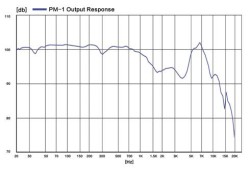 | PM-1の再生周波数特性のグラフ。再生帯域「●Hz〜●kHz」とかだけだと音を想像にしにくいが、その幅の中での特性やバランスをこのように視覚的に見せてもらえるとそれよりも想像しやすくて嬉しい。目立つ凹凸のない低域、なだらかに減衰しつつ自然に伸びる高域、そして視覚的にもエネルギーの密度等を感じられる中域に注目。 | ![]() |