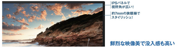液晶にはIPSパネルを採用したことで広い視野角と高輝度を実現したとしている。これにより、真横から見ても色味や輝度の変化をほとんど感じず、家庭用テレビを凌ぐ鮮烈な映像美を堪能できる。27型の大画面液晶で、視聴距離の近いデスクトップ環境で視野を覆いつくすことで高い没入感が得られる。ベゼルを約7mmの挟額縁にすることで、デザイン性も向上している。