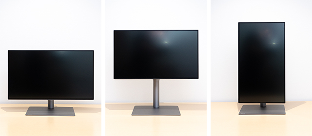 画面の上下のチルト、左右のスイーベルに加え、画面の高さ調整にももちろん対応。写真左が最低位置、写真中央が最高位置。またピボット機能も備え、写真右のように縦設置も可能だ