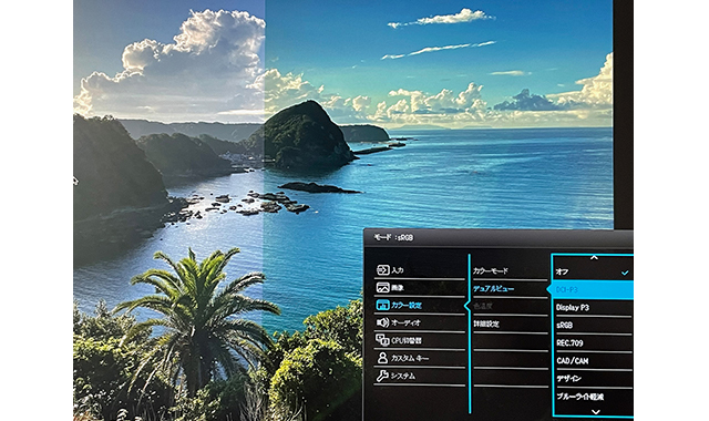 画面を左右分割し、左右それぞれに異なるカラーモードを設定することができる「デュアルビュー」機能を搭載。写真は左側をsRGB、右側をDCI-P3で表示している