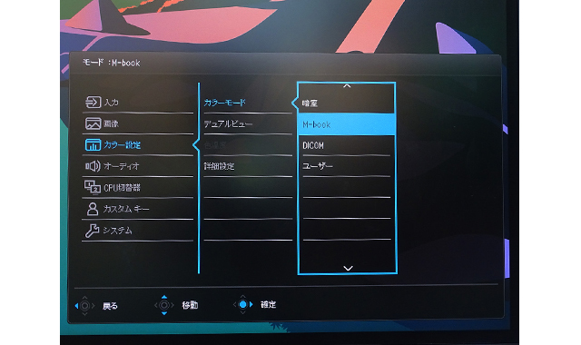 カラーモードのメニューには多彩なプリセットが登録されている。中でも「M-Bookカラーモード」は、ベンキューがアップルのPC製品の色味を測定し独自チューニングを施したアップルユーザー注目のカラーモードだ
