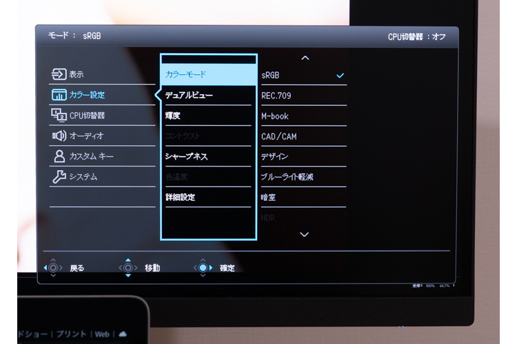 また、特徴的な機能として、本機が搭載する「M-Bookモード」についても触れておこう。AQCOLORシリーズの中でも、型番が「PD」から始まるデザイナー向けモデルは、元からMacのディスプレイをベンチマークにしているのではと感じさせるほどMacBookシリーズやiMacと画づくりが似ているが、映像モードをこの「M-Bookモード」に設定すると、MacのRetinaディスプレイの映像とより近くなる。オブジェクトの輪郭が一段と引き締まり、明暗のコントラストにメリハリを効かせた立体的な映像となるのだ。