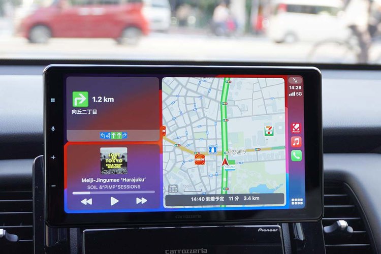 音楽を聴きながら地図を参照する場合は、Apple CarPlayやAndroid Autioに対応するディスプレイオーディオがマルチ画面モードに切り替わる。現在再生中の楽曲のカバーアートを小画面に表示しながら、画面タッチで楽曲の送り操作も行える。