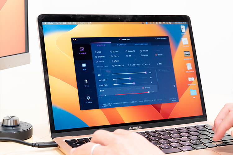 ディスプレイ制御アプリ「Display Pilot」をPCにインストールし、利用頻度の高い画面設定や、カラーモードを呼び出すためのショートカットキーをPC側で登録すれば、ひとまず準備完了。デフォルトの入力端子にはDisplayPortが選択されていたため、最初は何も映らず慌てたが、背面のボタンで入力をUSB-Cに切り替えると、カラープロファイルが自動設定されMacのデスクトップが現れた。