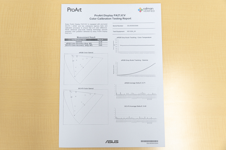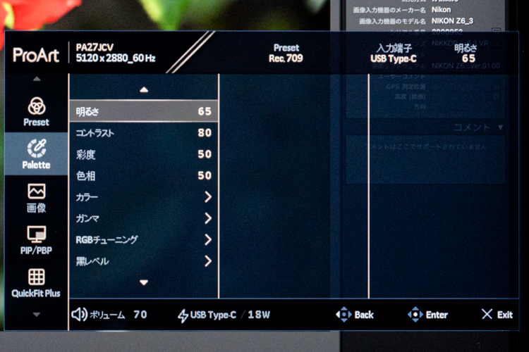 表示品質はProArt Displayらしい高品位なもの。出荷時の個別キャリブレーションがきちんとなされているため、購入後にPCと接続し、用途に合ったカラースペースのプリセットを選ぶだけで、かなり忠実な表示が可能だ。画面の表面反射もよく抑えられおり、明るい部屋でも黒の締まりもいい。画面内の均一度(ユニフォミティー)も実用十分に高い。