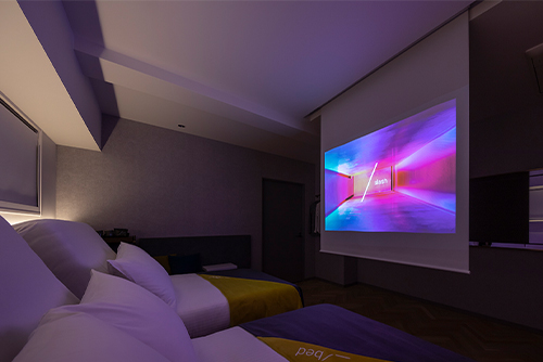 スクリーンもしくは壁に向けて大画面を投写するプロジェクターは、いずれもエプソン「EF-100」。枕元に設置されたHDMIもしくはUSB端子から、お手持ちのスマートフォンを接続して、映像や写真を大画面で楽しむことができます。