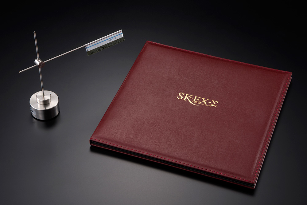 SFCの静電除去アイテム2製品。静電除去性能をもつサンダーロンの応用商品で、SK-EXΣはディスク用帯電イレーサーだ。LPだけでなくあらゆる光ディスクに対応して、本体にディスクを入れ30秒蓋を閉じれば、きれいに静電除去ができる。SK-FILTER SUSはレコードを再生しながら静電気除去ができるというスグレモノ。レコード面は非接触で、台座シャフト部がスチールからステンレスに変更されている。